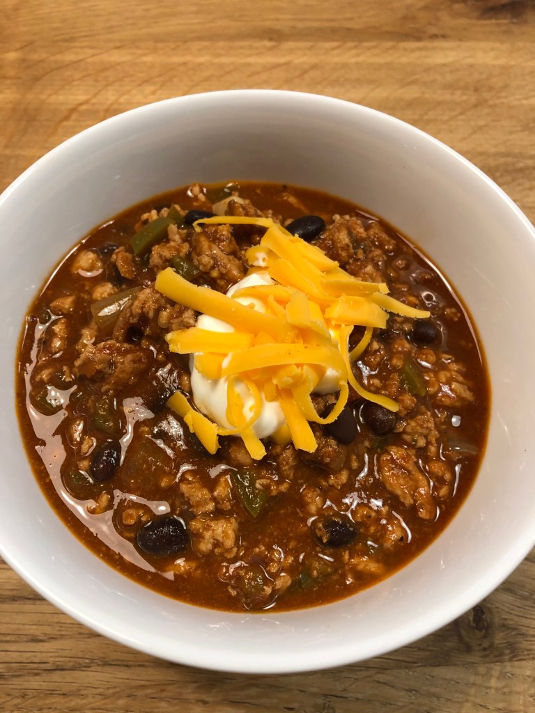 Heat a heavy bottom pot on medium high heat. Add turkey, let it brown and try not to stir it too much or it will get too broken up. Dice onions, prepare spices and open tomato sauce in the meantime. When meat is brown, turn heat down to medium and add the spices. Toasting will bring out the flavour, just do not burn them. Stir for 3 minutes. Add tomato sauce and cook for 5 minutes. This step helps caramelize the tomatoes and add bit of sweetness to counterbalance the bitterness from the chillies. Rinse the can out with water and add to the chili. Add onions, jalapeños, chipotles, chocolate, chicken paste and green peppers. Stir and reduce heat to a simmer. Stir occasionally. At this point, it’s up to you how long you let it simmer. The longer the better. You will have to add a bit more water if you do. I let mine simmer almost 3 hours and added about 3/4 cup of water. Just don’t forget to add the beans. I like to put mine in about 30 minutes before serving, so they don’t get too soft and fall apart. Top with all your favourites and serve with tortilla chips.