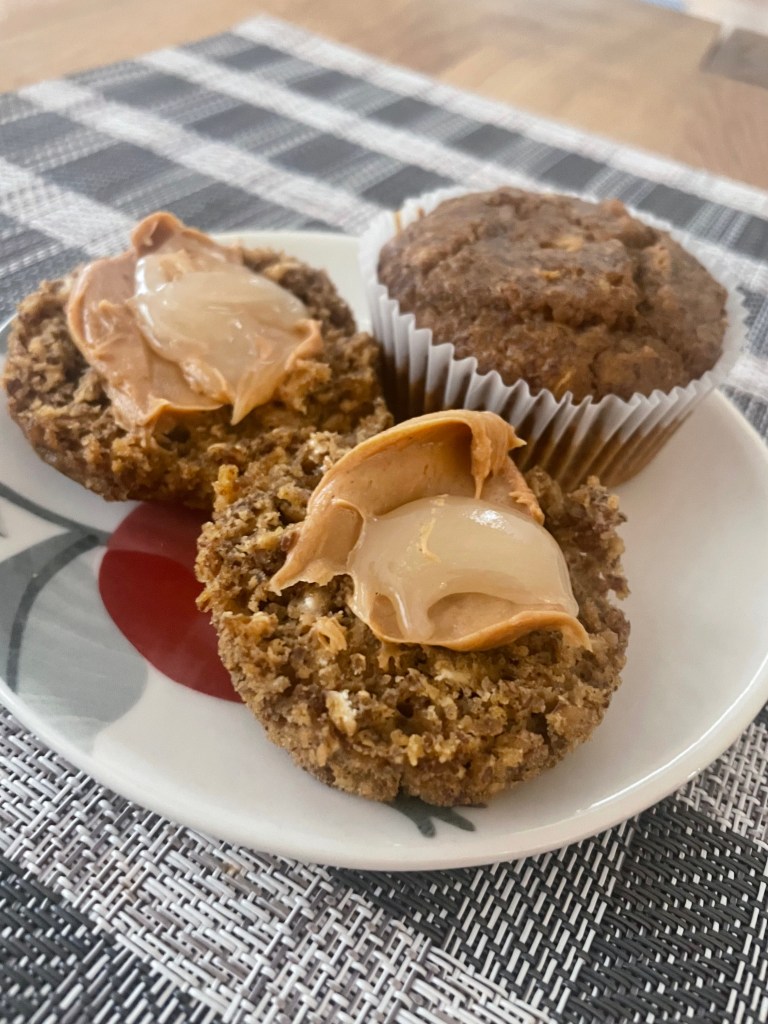 Preheat the oven to 350F. In a good size bowl add the dry ingredients and mix. In another bowl mix the wet ingredients. Combine the wet mixture into the dry, stirring until incorporated well. I like to let it sit for about 10 minutes, so the oatmeal has a chance to soften up. Line a muffin pan with paper cups and add the muffin batter. Bake for 14-16 minutes, or until a toothpick inserted in the middle comes out clean. I like to serve mine with peanut butter and honey. Enjoy.