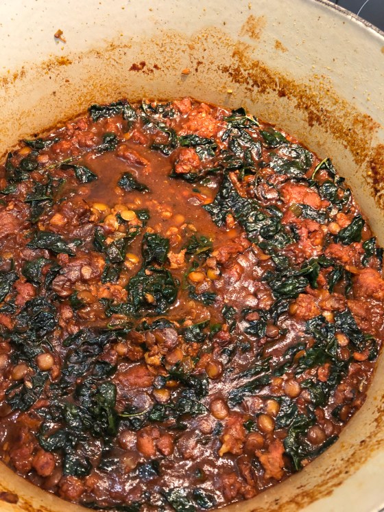 This Korean Sausage, Lentil and Kale Stew is umami heaven in a bowl.